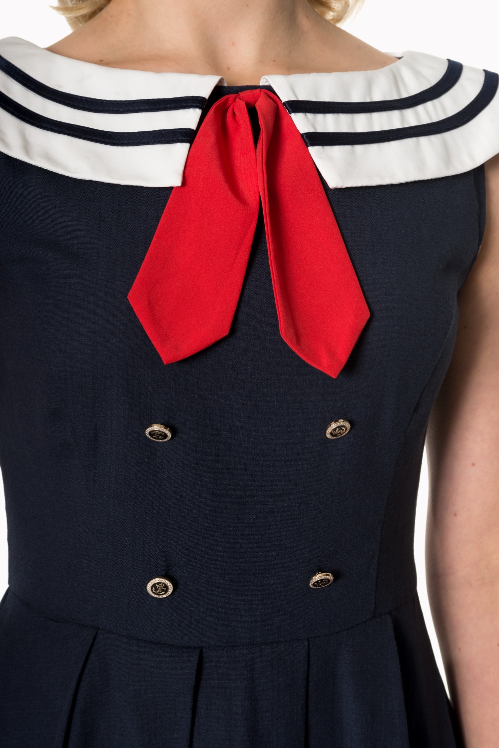 Vintage aquarius dress by Banned Apparel. Available in blue or navy the aquarius has an nautical inspired theme with a white and blue striped all round collar.
