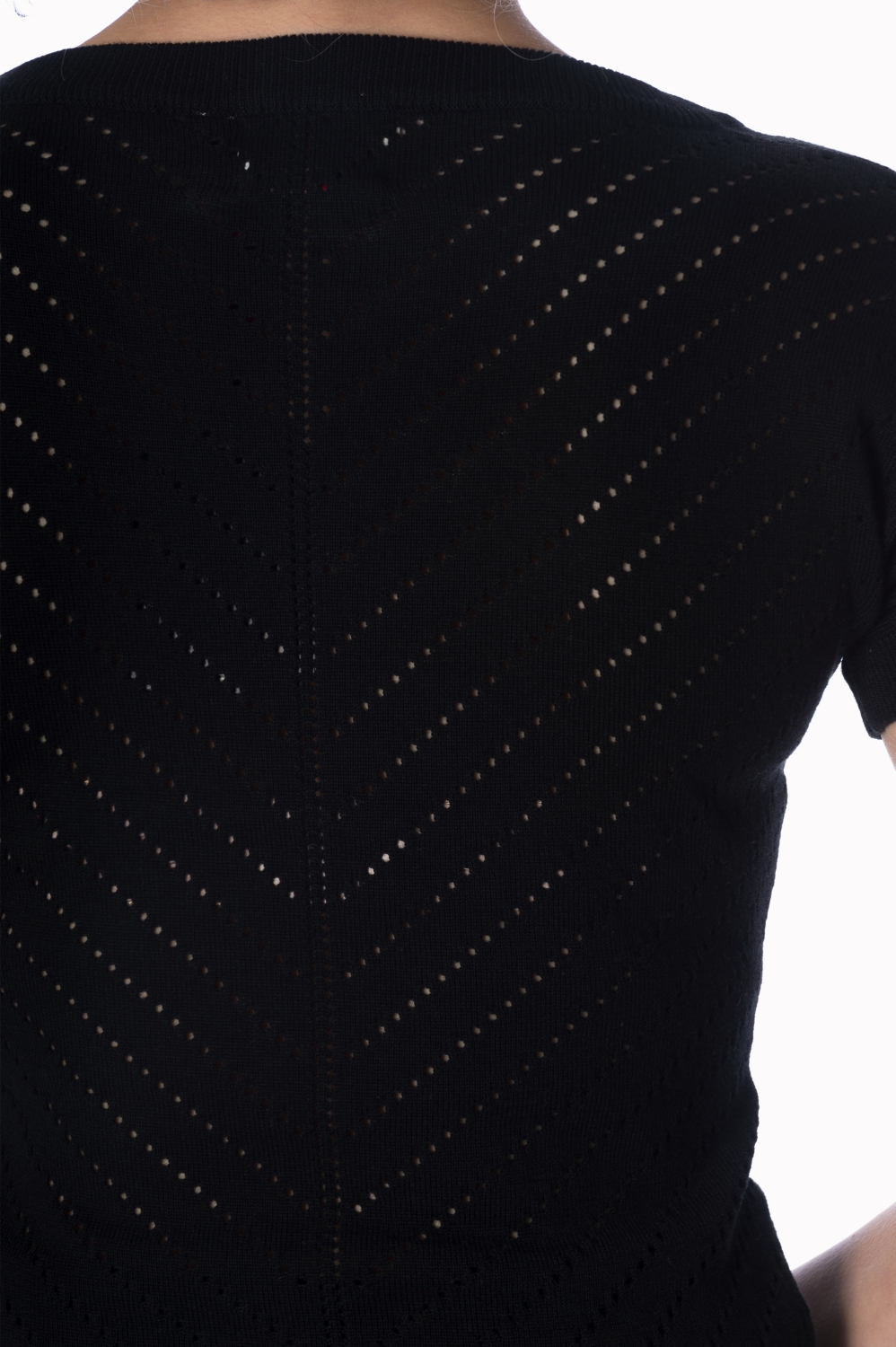 Womens vintage retro knitted top by Banned Apparel. Available in black, white or navy the Patricia Piontelle top has short sleeves, a V neck with tie detailing and V shape knit patterning. 60% viscose, 40% cotton. Machine washable.
