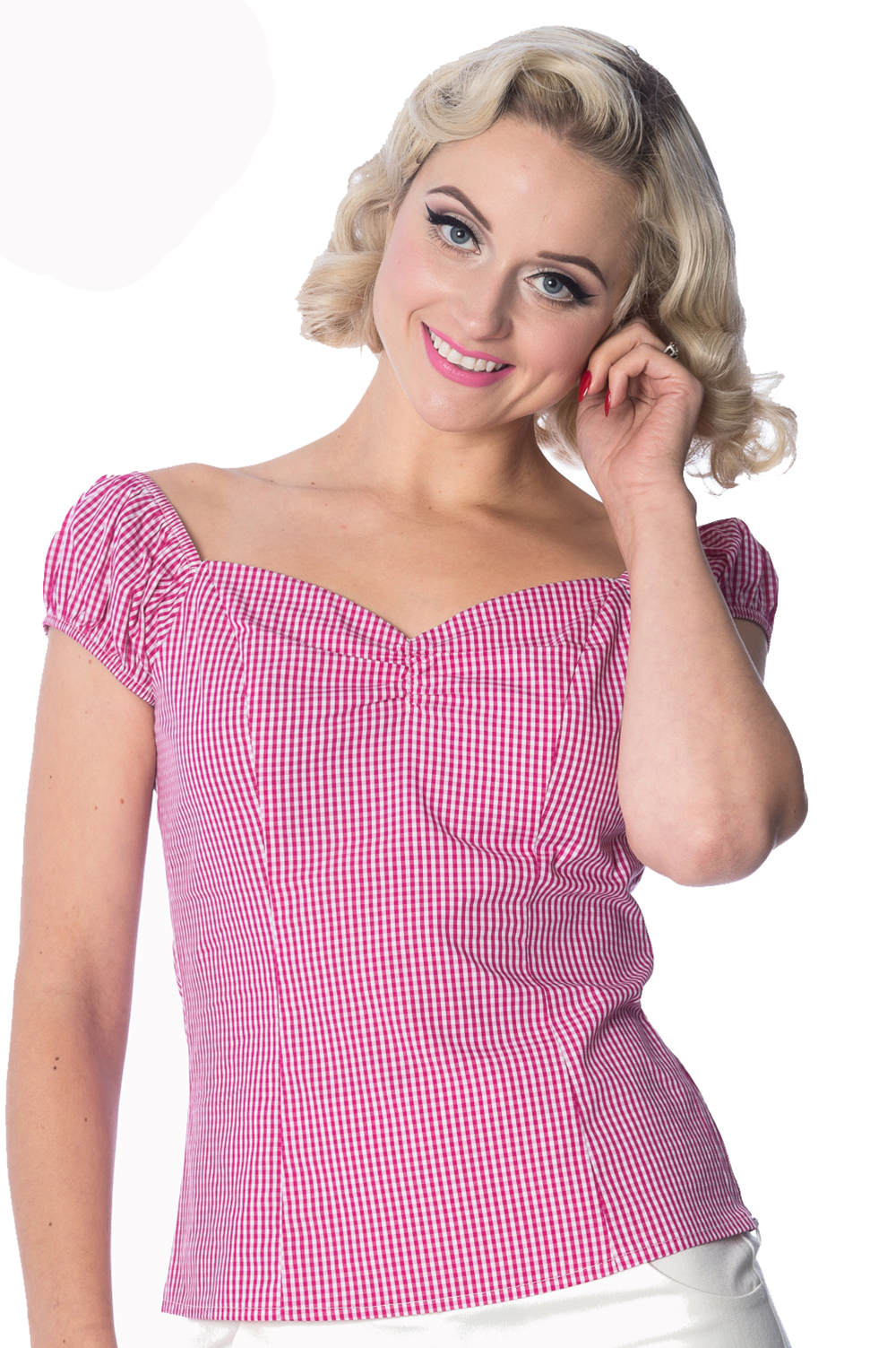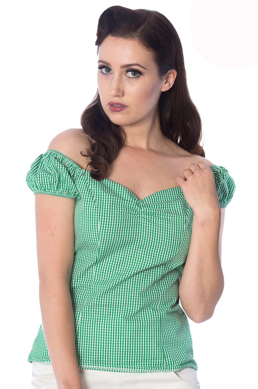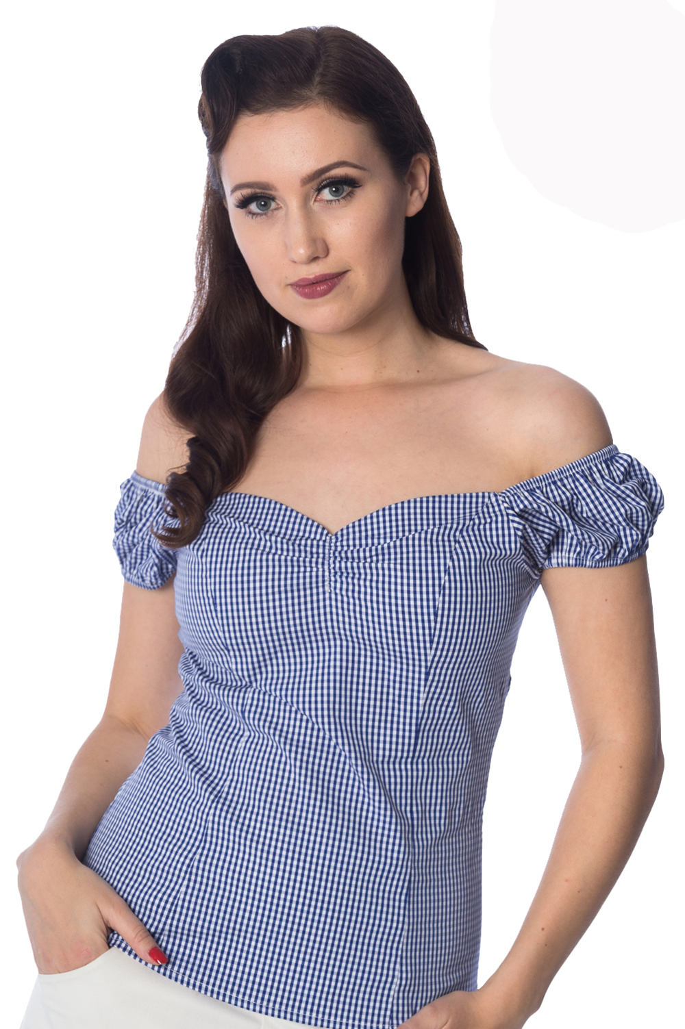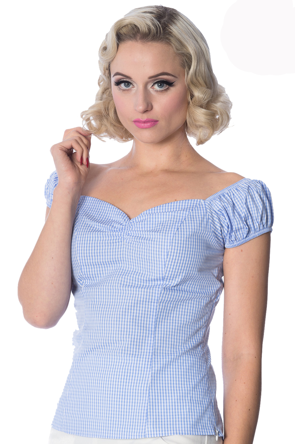 Vintage retro top by Banned Apparel. Available in eight colours, the Summer Loving features a delicate gingham check pattern with sweetheart neckline and crop sleeves that can be worn off the shoulder.
