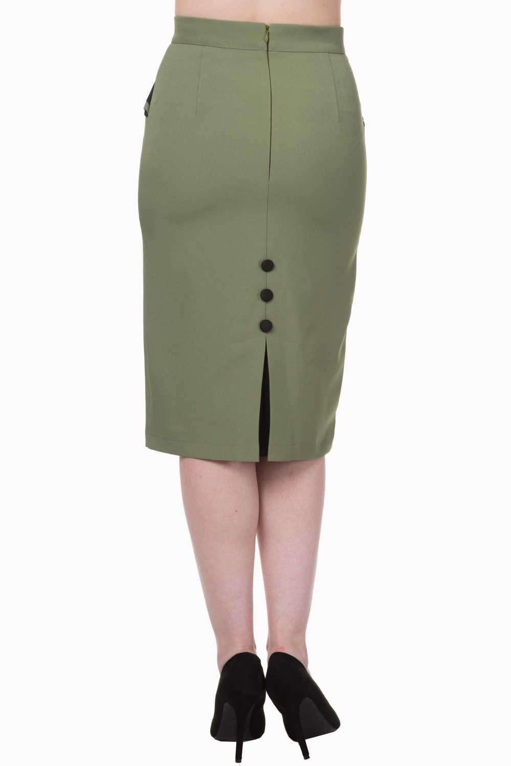 Fitted vintage pencil skirt. Available in retro leopard print, plain black or plain red. Midi length with side pockets and button detail. Invisible side seam zip and centre back seam. For a very glamorous vintage style.